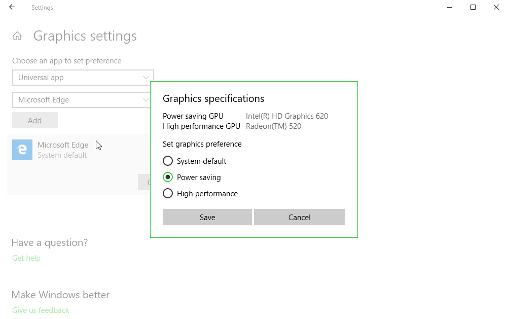 Seperti gambar diatas, penulis memasukkan aplikasi “Microsoft Edge” ke dalam daftar, kemudian memilih opsi “Power saving”. Itu artinya Microsoft Edge hanya akan menggunakan Intel HD 620, dimana itu adalah integrated graphics milik Intel yang memang lebih hemat daya dibandingkan AMD Radeon 520.