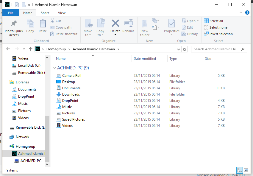 Jika anda sudah mengetahui kecepatan jaringan anda, anda bisa memulai membuat HomeGroup kepada jaringan anda. Pertama, silahkan anda akses HomeGroup di File Explorer dengan menekan kombinasi WINDOWS + E. HomeGroup terletak di bagian paling bawah seperti pada gambar diatas.