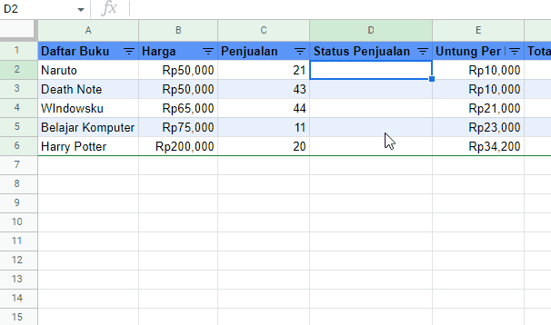 Pengembangan dan latihan: Lakukan merge untuk sel lainnya seperti nomor dan nama buku. Kemudian, buatlah agar tabel tersebut bisa di filter.